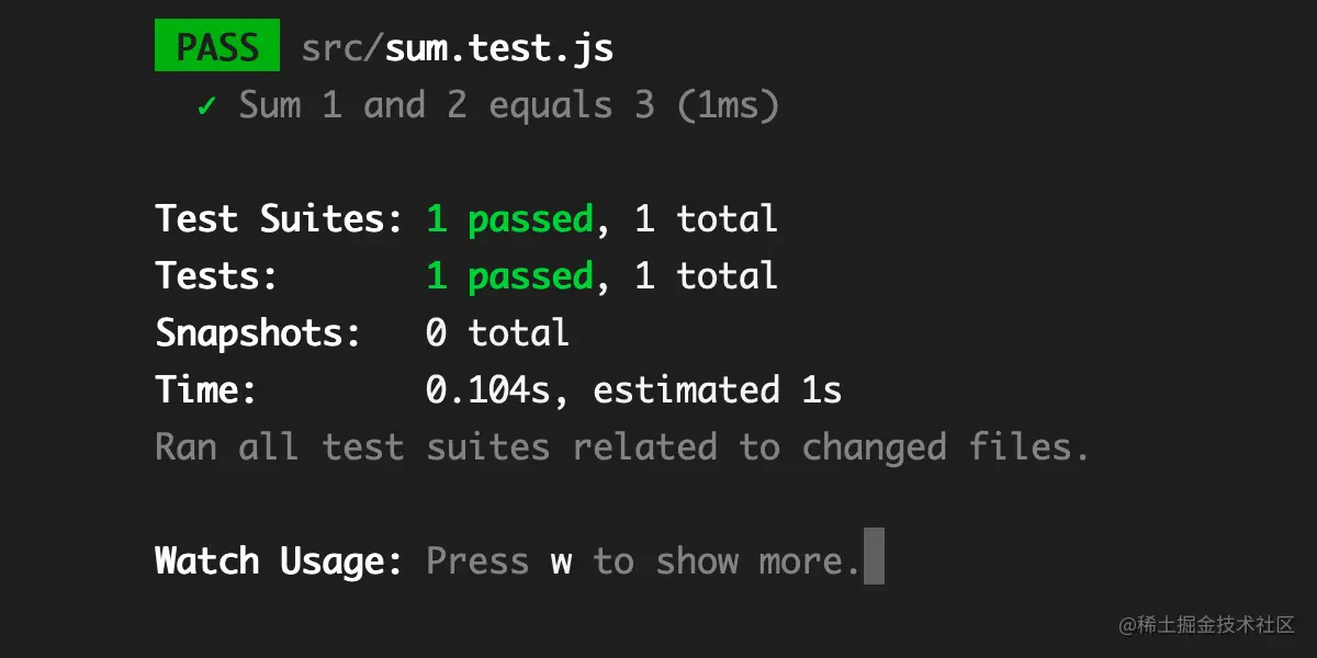 测试命令将运行您使用Jest编写的任何测试脚本。您的测试将在节点环境下运行。Jest将在交互式监视模式下运行,这意味着每次您保存文件时,它将重新运行测试,就像启动命令重新编译代码一样。