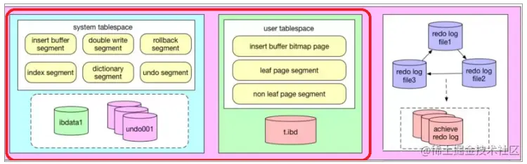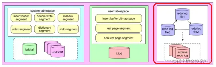 InnoDB的主要的磁盘文件主要分为三大块:一是系统表空间,二是用户表空间,三是redo日志文件和归档文件。