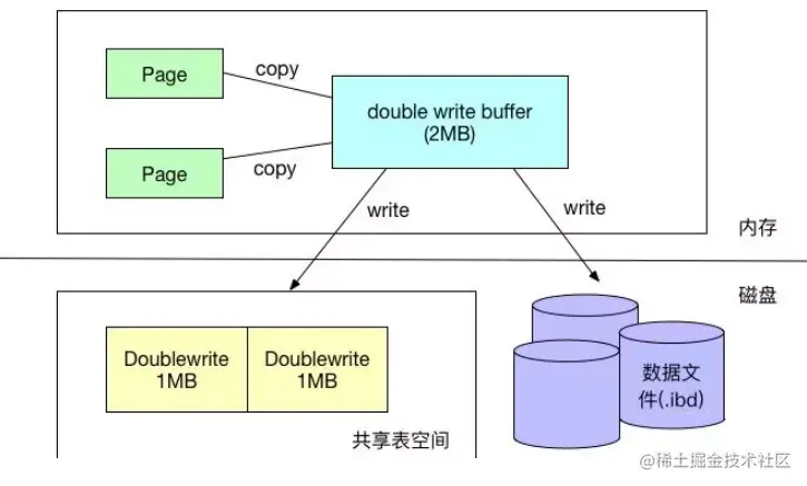 - 通过double write buffer再分两次,每次1MB顺序地写入共享表空间的物理磁盘上
