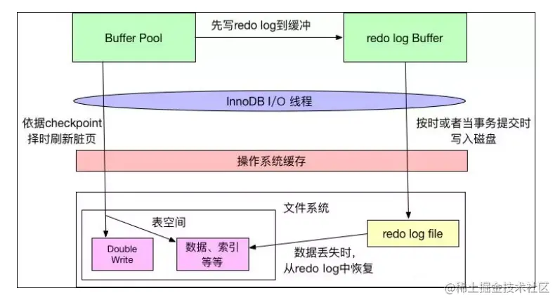对于数据库中页的修改操作,则首先修改在缓冲池中的页,然后再以一定的频率刷新到磁盘上。页从缓冲池刷新回磁盘的操作并不是在每次页发生更新时触发,而是通过一种称为CheckPoint的机制刷新回磁盘。