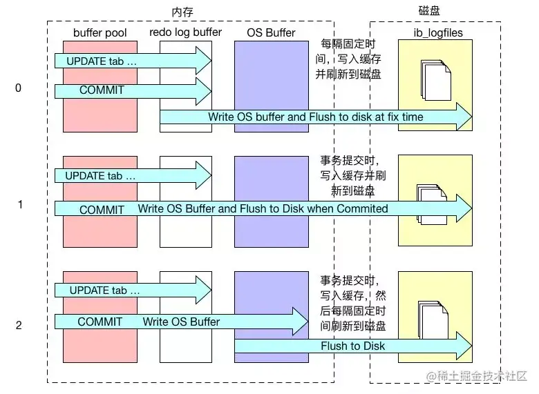 - 0:MySQL每秒一次将数据从log buffer写入日志文件并同时fsync刷新到磁盘中。每次事务提交时,不会立即把 log buffer 里的数据写入到redo log日志文件的。如果MySQL崩溃或者服务器宕机,此时内存里的数据会全部丢失,最多会丢失1秒的事务。