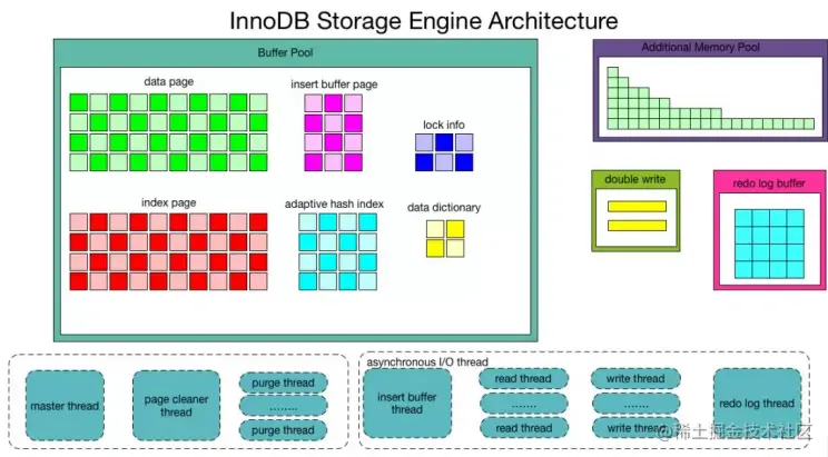 从图中可见,InnoDB存储引擎由内存池,后台线程和磁盘文件三大部分组成。