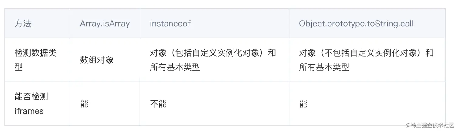优点:当检测Array实例时,Array.isArray 优于 instanceof ,因为 Array.isArray 和Object.prototype.toString.call可以检测出 iframes,而instanceof不能