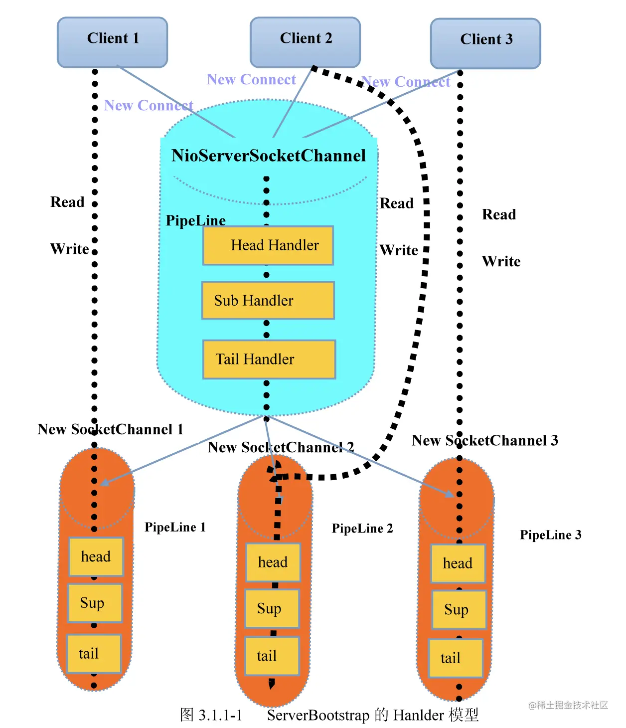 Netty拥有两个NIO线程池,分别是bossGroup和workerGroup,前者处理新建连接请求,然后将新建立的连接轮询交给workerGroup中的其中一个NioEventLoop来处理,后续该连接上的读写操作都是由同一个NioEventLoop来处理。注意,虽然bossGroup也能指定多个NioEventLoop(一个NioEventLoop对应一个线程),但是默认情况下只会有一个线程,因为一般情况下应用程序只会使用一个对外监听端口。