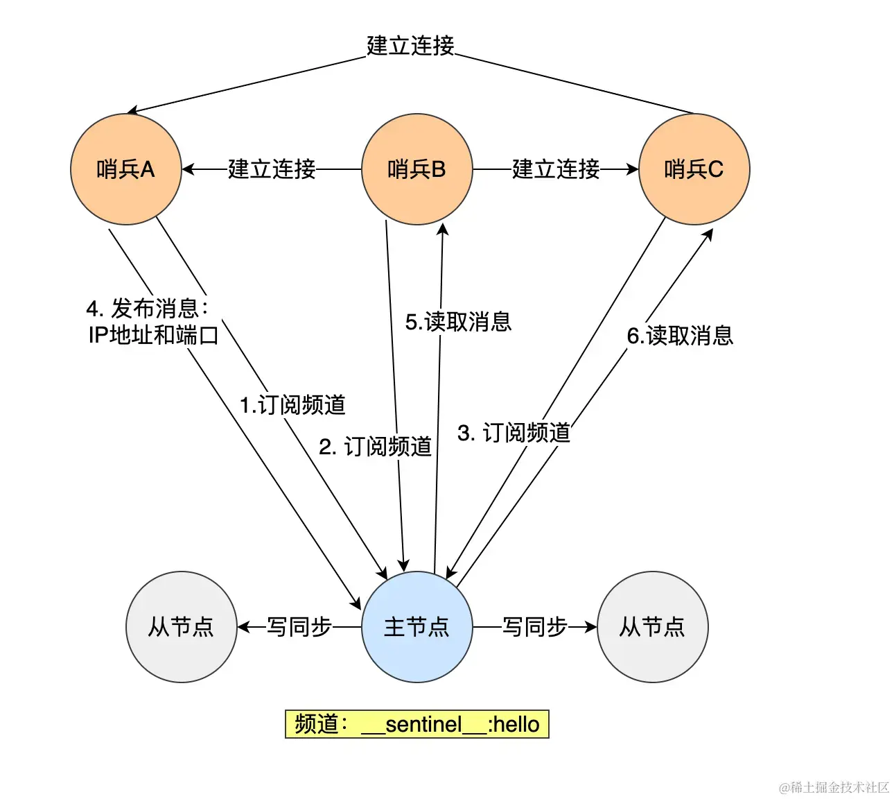 - 每隔 2s。哨兵会向 sentinel:hello 频道发送自身的哨兵信息以及对主节点故障的判断,哨兵节点集合中的所有节点均会订阅这个频道。当有新的哨兵加入时会订阅这一频道,从而与各个哨兵建立连接,交换信息。