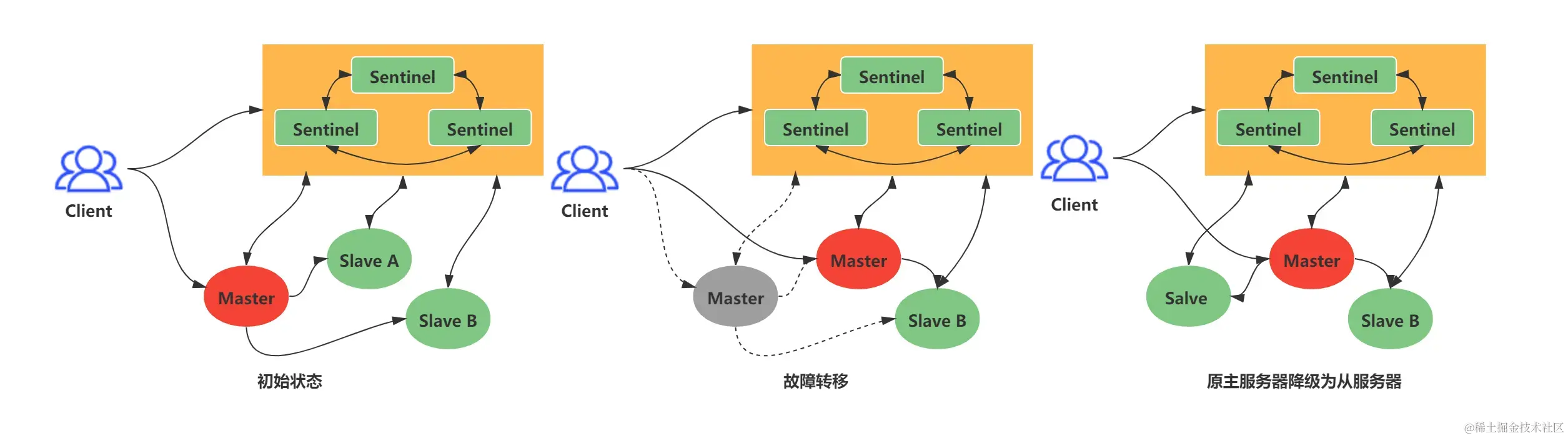 - 继续监视旧主节点,如果节点重新上线,则将它设置为新主节点的从节点。