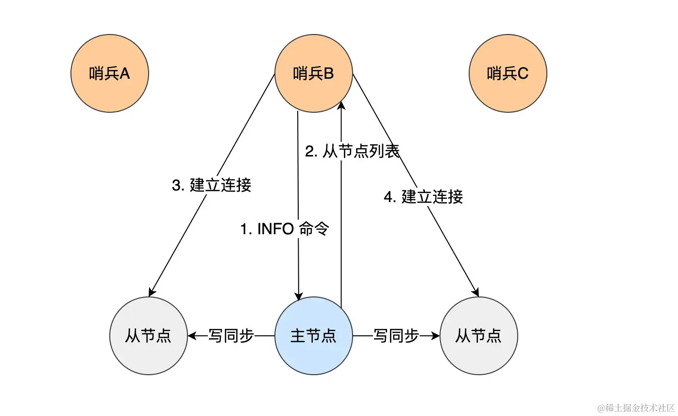 - 每隔 10s。哨兵会向主节点发送 info 命令来获取最新的节点拓扑信息,同时与从节点建立连接。通过这一命令,可以使哨兵只配置主节点的信息下,获取到各个节点的拓扑信息。