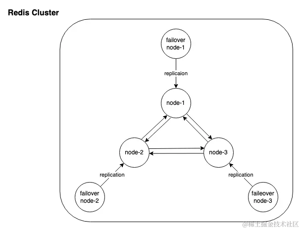 在 Redis 3.0 可以使用官方提供的分布式解决方案,整体拓扑结构如下。集群中有三个主节点提供读写能力,每个主节点会搭配一个从节点,默认情况下从节点不支持任何读写操作,仅作为主节点的一个热备存在。不同节点之间会通过协议交换信息获取集群的整体状体。