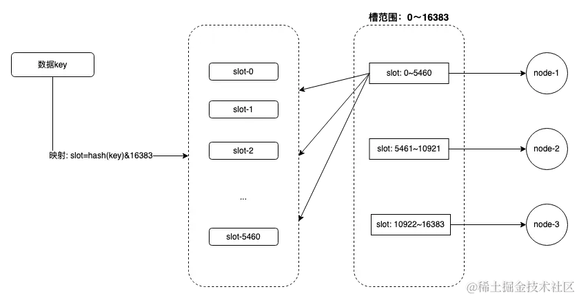 在 Redis 中使用的是固定数分区,即将整体数据分为固定数量的虚拟分区,每个节点分布不同数量虚拟分区。又叫虚拟槽分区。共有 163483 个槽,数据通过哈希计算确定具体的槽,不同的节点分配不同的槽范围。