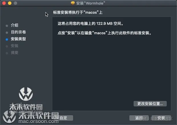 下载完成后双击Wormhole.pkg安装,欢迎安装Wormhole mac版,点击继续Wormhole for mac版占用你104.7mb,点击安装