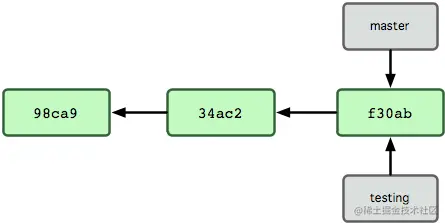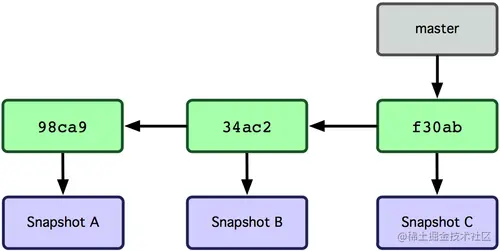 Git 中的分支,其实本质上仅仅是个指向 commit 对象的可变指针。Git 会将 master 作为分支的默认名字。若干次提交以后,其实已经有一个指向最后一次提交对象的 master 分支,他在每次提交的时候都会向前移动。