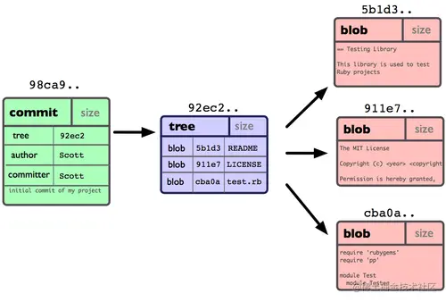 现在仓库中有了五个对象:三个文件表示快照内容 blob 对象;一个记录这目录树内容和其中各个文件对应 blob 对象索引的 tree 对象;还有就是一个包含指向 tree 对象的索引和其他提交信息源数据的 commit 对象。