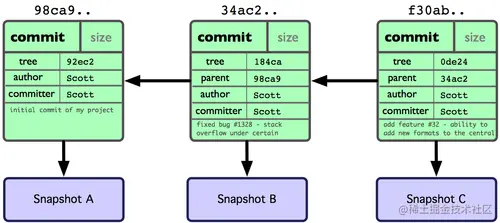 在工作目录中有三个文件,准备将他们暂存后提交。暂存操作会对每一个文件计算校验和(SHA-1哈希串),然后把当前版本的文件快照保存在 Git 仓库中(Git使用blob类型的对象存储这些快照), 并将校验和加入暂存区域。 当使用 git commit 新建一个提交对象前,Git 会先计算每一个子目录的校验和吗,然后在 Git 仓库中将这些目录保存为树(对象);之后 Git 创建的提交对象,除了包含提交信息外,还包含了指向整个树对象的指针。这样将来需要的时候,重现此次快照的内容了。