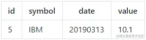 假定本例中的数据储存在平面文件数据库,以二进制格式按行存储,数据从文件头部直接开始存储。每行有四列,分别为id(按有符号64位长整型格式存储,8字节),symbol(按C字符串格式存储,8字节),date(按BCD码格式存储,8字节),value(按IEEE 754标准的双精度浮点数格式存储,8字节),每行共32字节。以下是一行的例子: