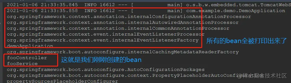 注意,除了我们定义的bean之外,它还将记录该容器中的所有其他bean。为了清楚起见,我们在这里省略了它们,因为它们有很多。