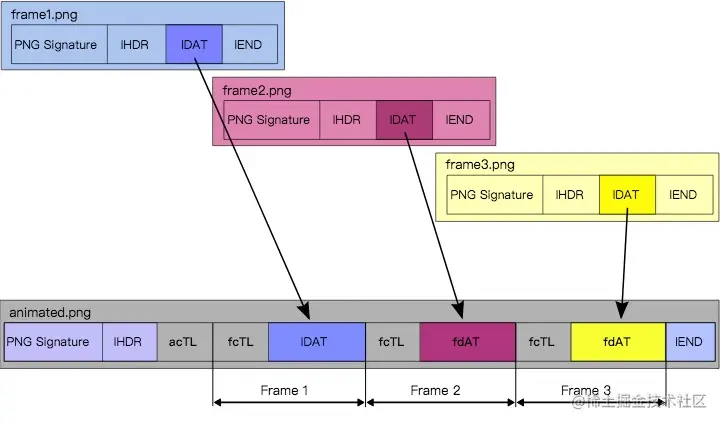 可以看到,APNG 在 PNG 的基础上增加了 acTL、fcTL 和 fdAT 3 种模块