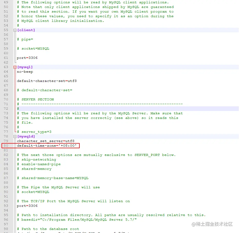 在该文件的[mysqld]字段下面添加一行:default-time-zone=’+08:00’,保存即可。下次再重启MySQL时,时区仍为东八区,不会还原。