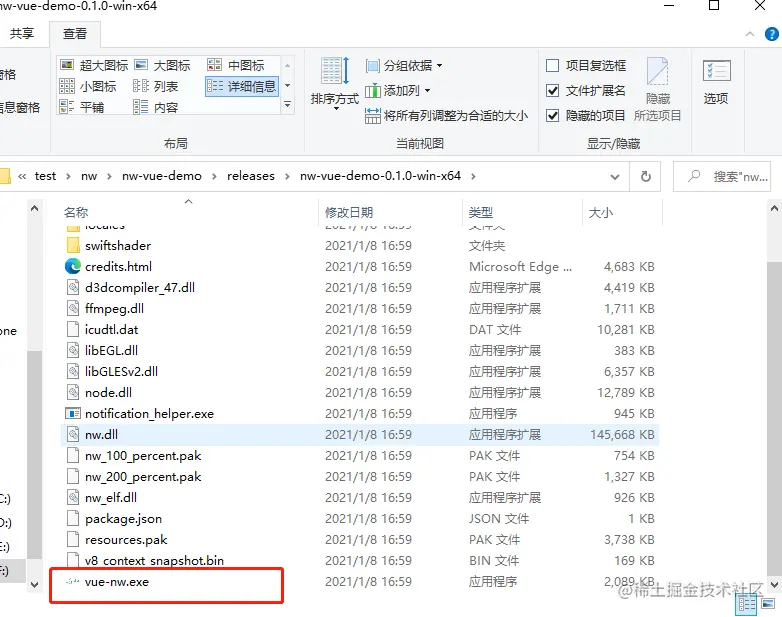 注意:笔者尝试了下将dist文件夹放在app及package.nw目录下,然后修改package.json中的main路径,但是出现异常;而将dist目录去掉把index.html和其他文件直接放在app及package.nw目录下可以正常启动成功。可能是缓存原因