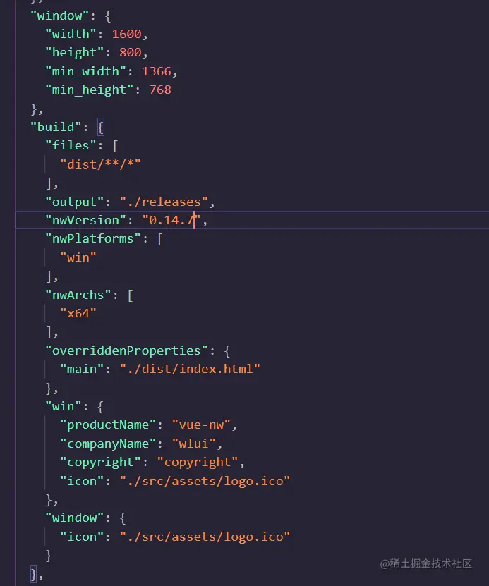 在package.json中scripts下增加一行脚本命令cnpm install nwjs-builder-phoenix --save-dev"build:nw": "npm run build && build --tasks win-x86 --mirror https://npm.taobao.org/mirrors/nwjs/ .", // win-x86版 "build:nw:all": "npm run build && build --tasks win-x86,win-x64,linux-x86,linux-x64,mac-x64 --mirror https://npm.taobao.org/mirrors/nwjs/ .", // 打包多版本 - 在package.json中配置基本打包参数