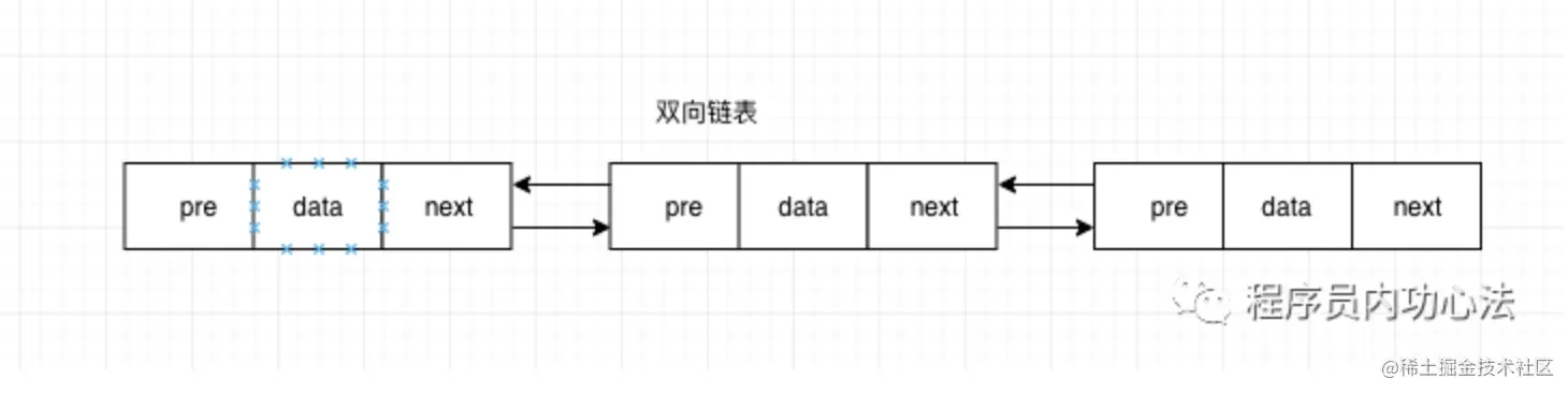 与单点链表相比,双向链表增加了一个指向前面节点的pre指针,同事需要额外的一个空间来存储前驱结点的地址。所以,如果存储同样多的数据,双向链表要比单链表占用更多的内存空间,双向链表结构如下: