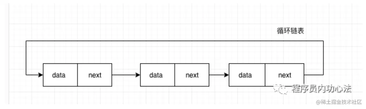 单链表的循环链表结构就是在单链表的基础上将尾节点的next指针指向头节点