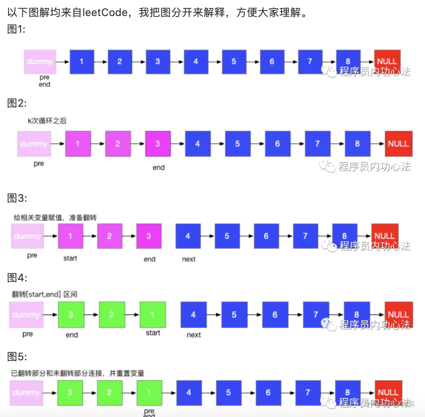 LeetCode第25题,链表翻转,以下解题思路和图来自力扣,附加一些本盟主的理解和注释,方便大家更好的理解。题目描述:给你一个链表,每 k 个节点一组进行翻转,请你返回翻转后的链表。k 是一个正整数,它的值小于或等于链表的长度。如果节点总数不是 k 的整数倍,那么请将最后剩余的节点保持原有顺序。代码如下: