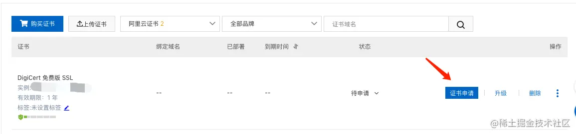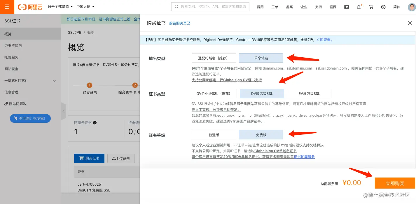 - 选择免费证书-点击立即购买