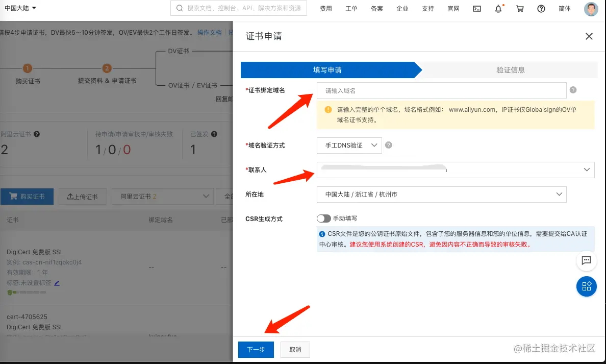 主要填写证书绑定域名,联系人,其他默认,申请成功后进入