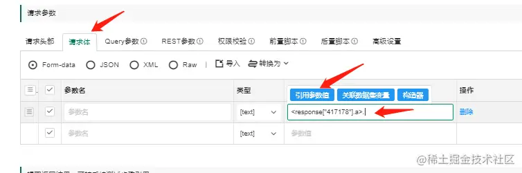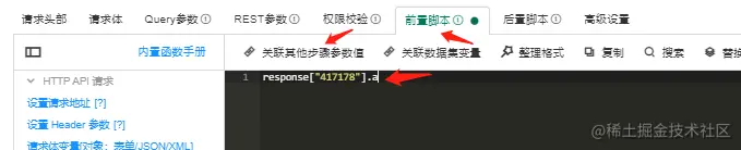 方法1:直接在请求体中直接关联上个接口的返回值,代码为<response["id"].deta.list[0].resourceid>