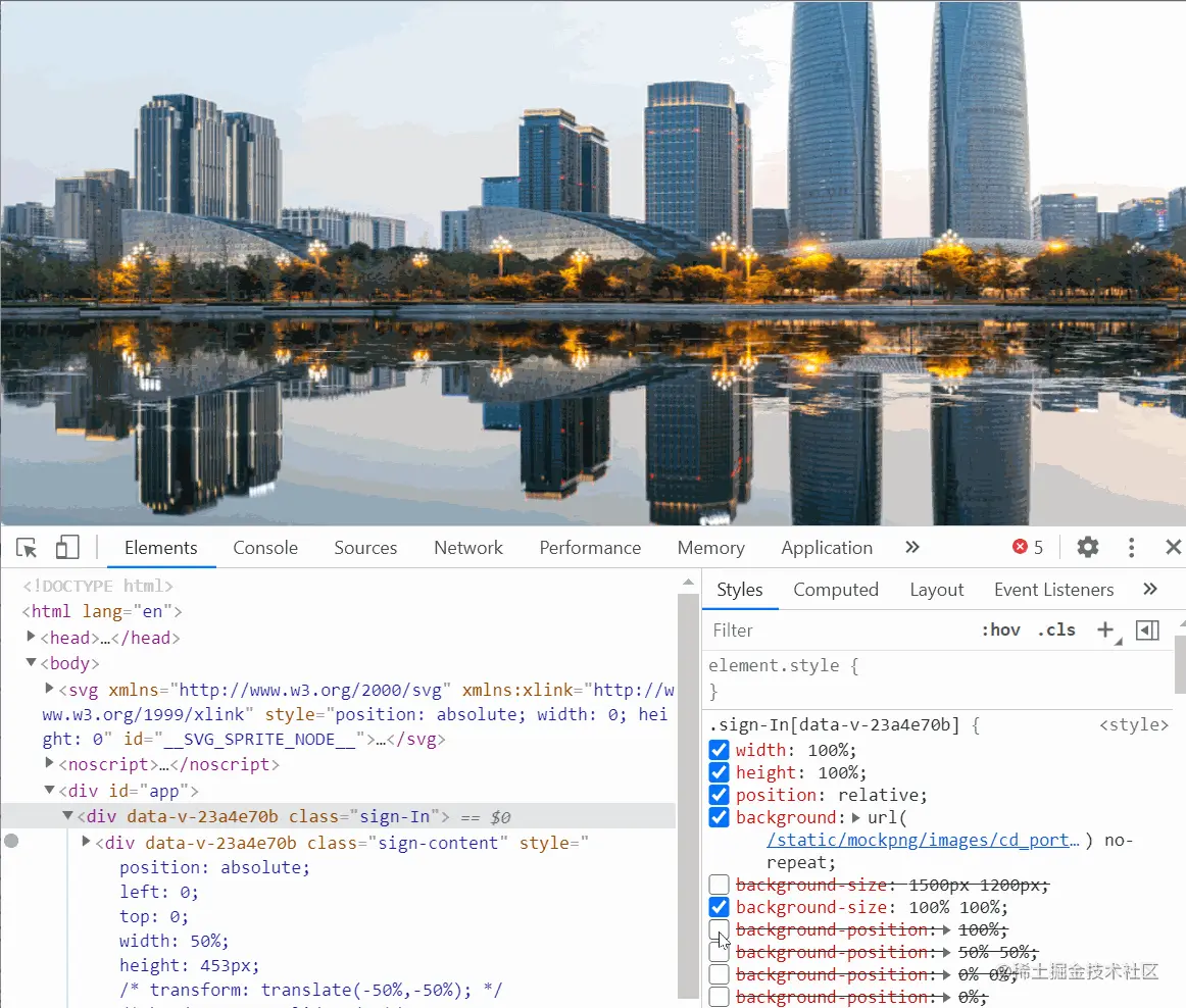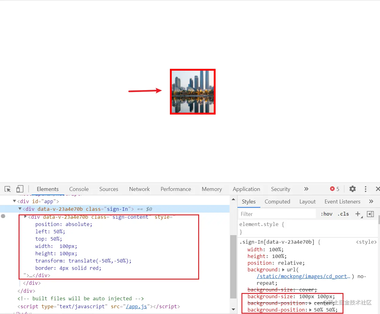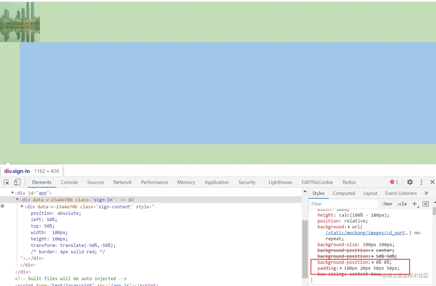 可以看到,现在背景图现在处于元素正中央的位置,为了证实是正中央的位置,我用了一个具有居中样式的子元素做对比,可以看到正好被子元素框柱。