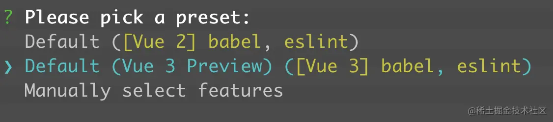 如图,使用 vue create my-app 创建项目,会有如下提示,选择中间项可以直接创建3.0的项目,选择最后一项,可以手动选择创建2.0或者3.0版本和其他配置项。