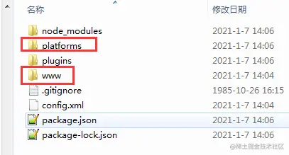 platforms是原生工程目录,www目录下放置前端打包后的文件
