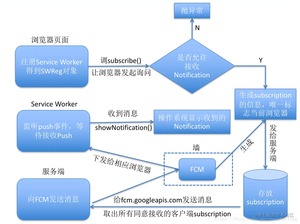在浏览器端,注册一个Service Worker之后会返回一个注册的对象,调的pushManager.subscribe让浏览器弹框;