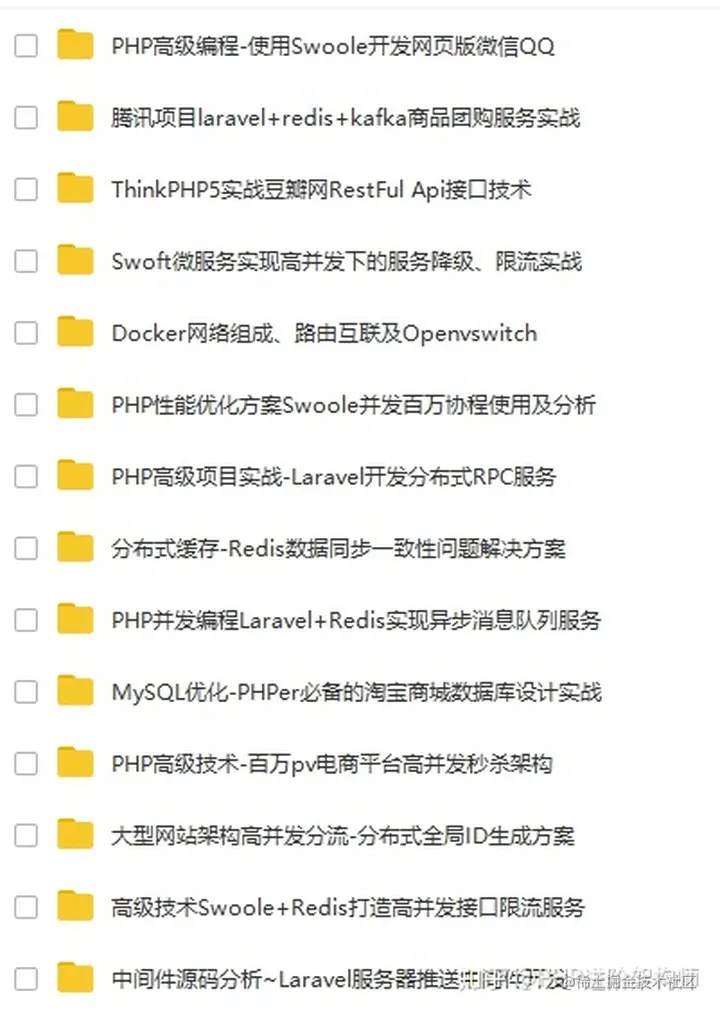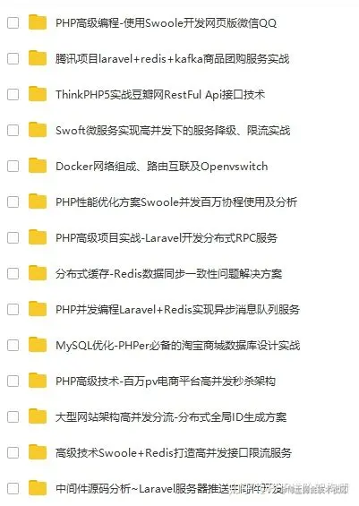 很多PHP程序员在进阶的时候总会遇到一些问题和瓶颈,业务代码写多了没有方向感,不知道该从那里入手去提升,对此我整理了一些教程资料,包括但不限于:分布式架构、高可扩展、高性能、高并发、服务器性能调优、TP6,laravel,YII2,Redis,Swoole、Swoft、Kafka、Mysql优化、shell脚本、Docker、微服务、Nginx等多个知识点高级进阶干货需要的可以免费分享给大家,PHP进阶架构师需要请戳这里