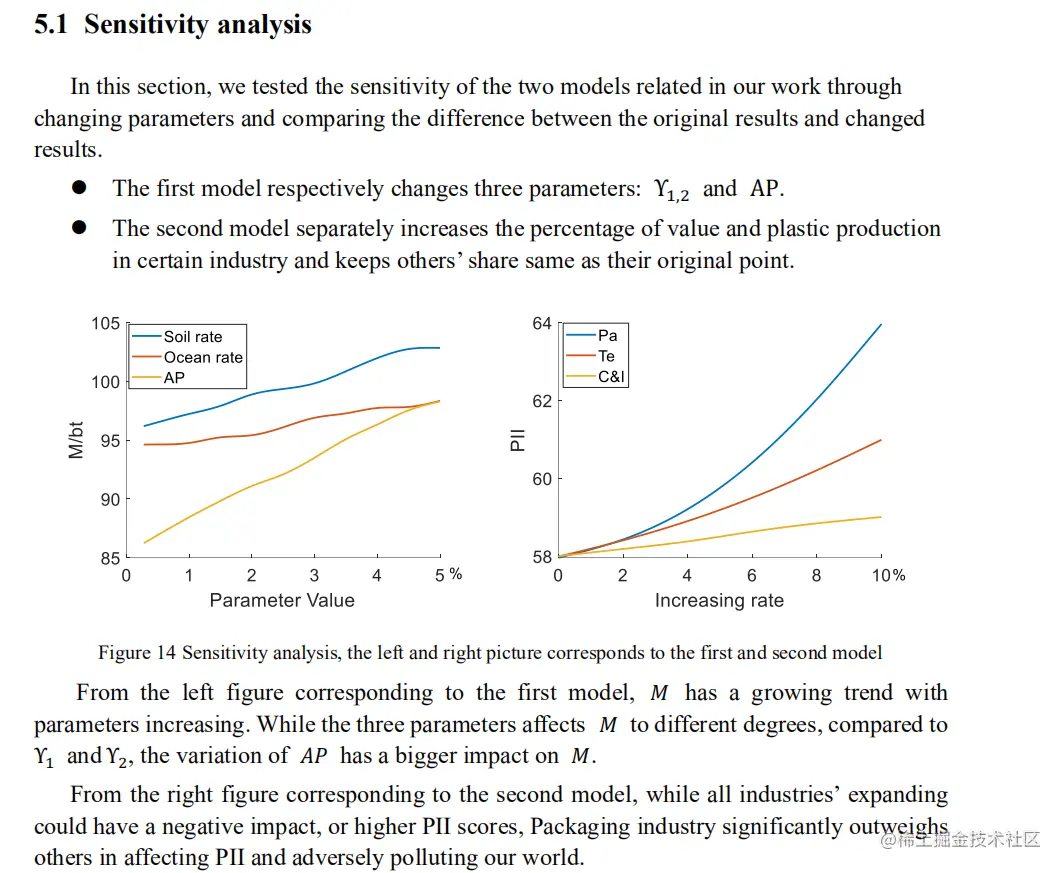 2020年E题特奖论文 <<Less Waste & better World>> 通过引入增加了某些行业的价值和塑料生产的百分比,并且通过改变参数和比较原始结果和改变结果之间的差异来测试相关的两个模型的灵敏度