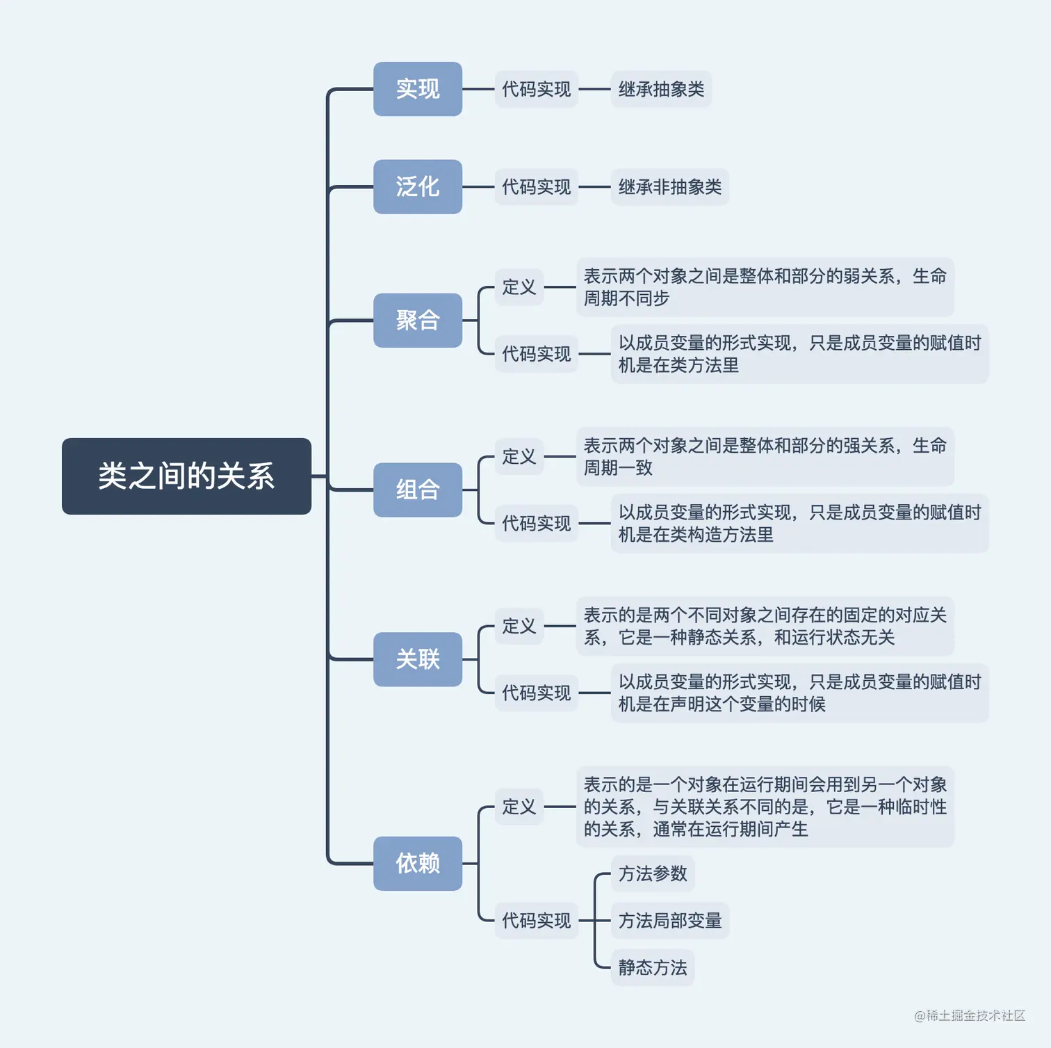 以上例子和图中我都把类的六种关系特别标注出来了,下面我们具体讲讲这六种关系