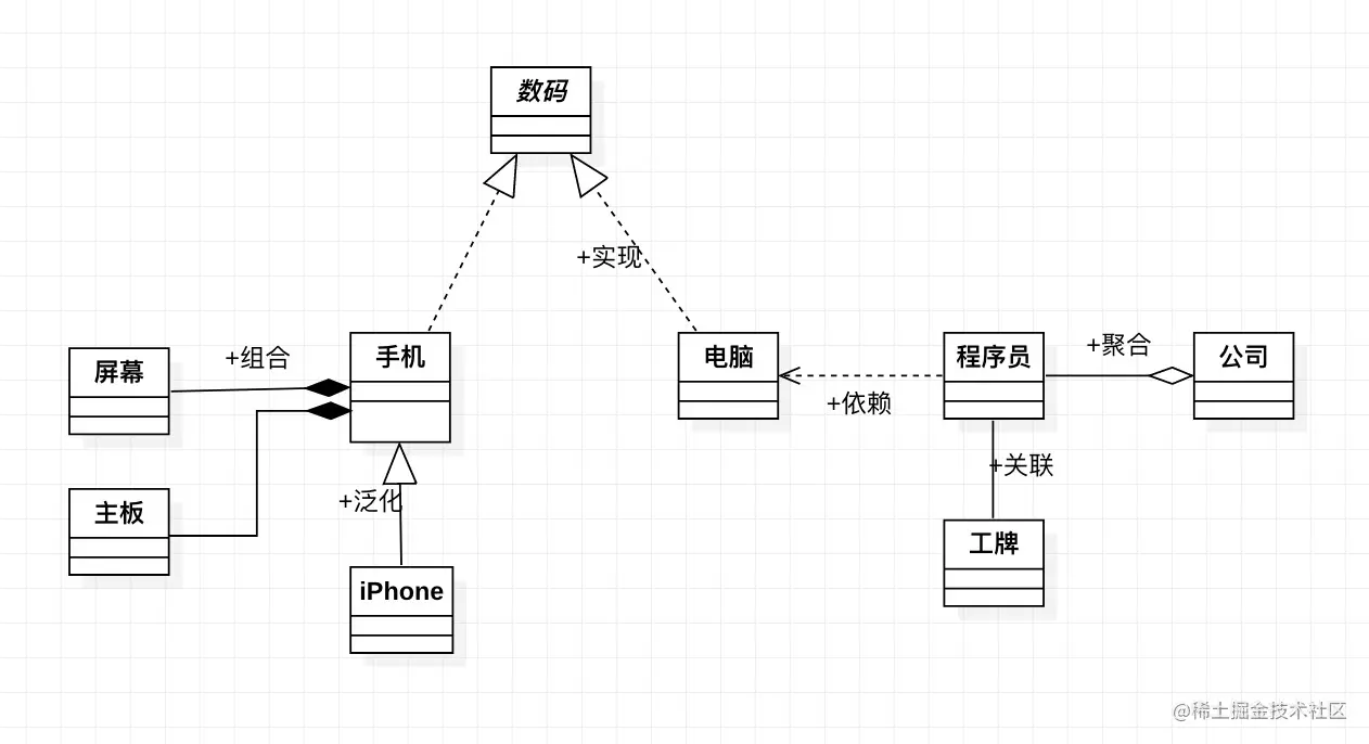 - 数码有两个继承类,分别是手机和电脑,他们之间的关系是实现关系,用带空心箭头的虚线表示