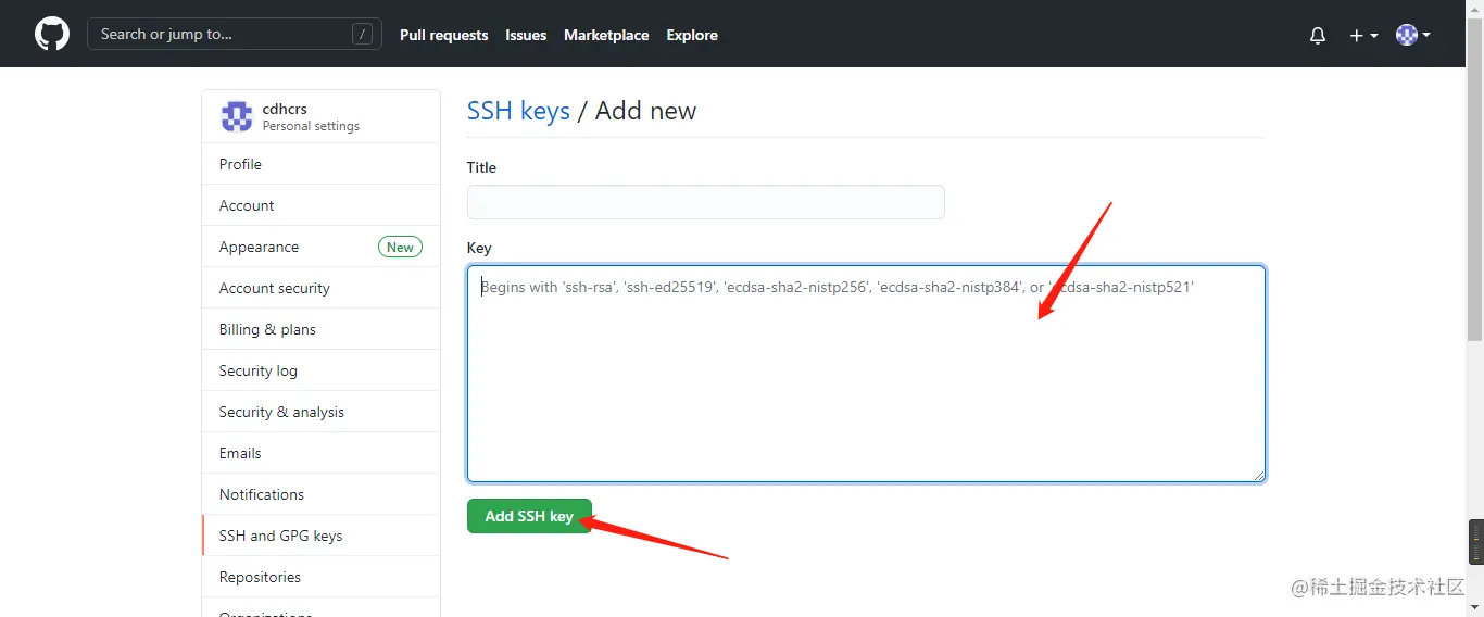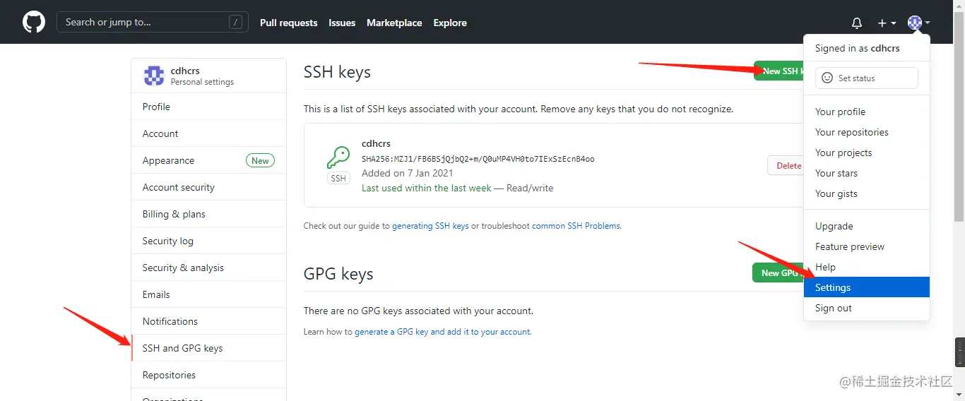 - 找到SSH and GPG keys选项,点击New SSH Key按钮