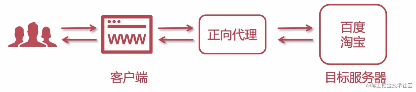 客户端请求目标服务器之间的一个代理服务器,请求会先经过代理服务器,然后再转发请求到目标服务器,获得内容后最后响应给客户端