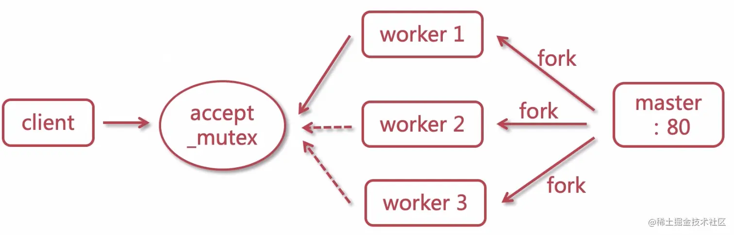 客户端请求进来后,worker争抢accept_mutex锁,谁抢到谁处理这次请求。