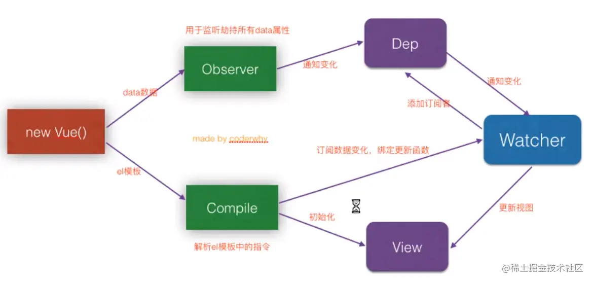 在new Vue的时候,在Observer中通过Object.defineProperty()劫持数据,代理所有数据的getter和setter属性,每次触发setter会通过Dep来通知Watcher,Watcher作为Observer和Complie之间的桥梁,当Observer监听到数据发生改变时会通过update来通知Complie更新视图。而Complie通过watcher订阅对应数据,绑定更新函数,通过Dep来添加订阅者,达到双向绑定。
