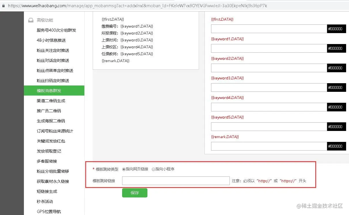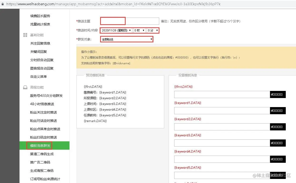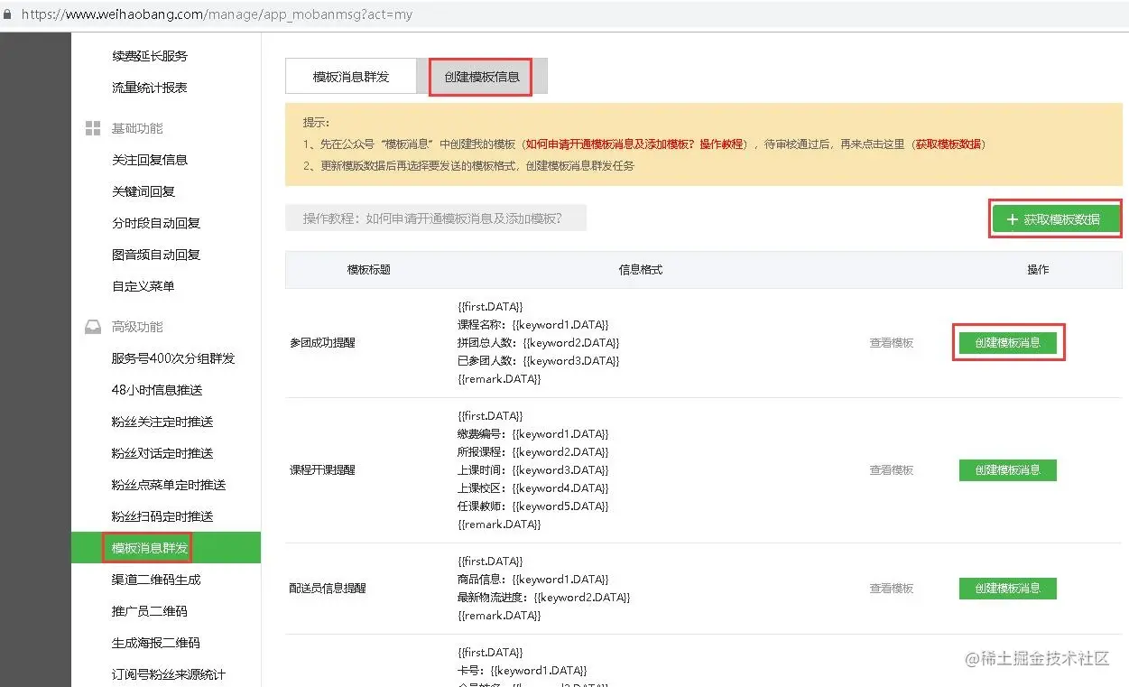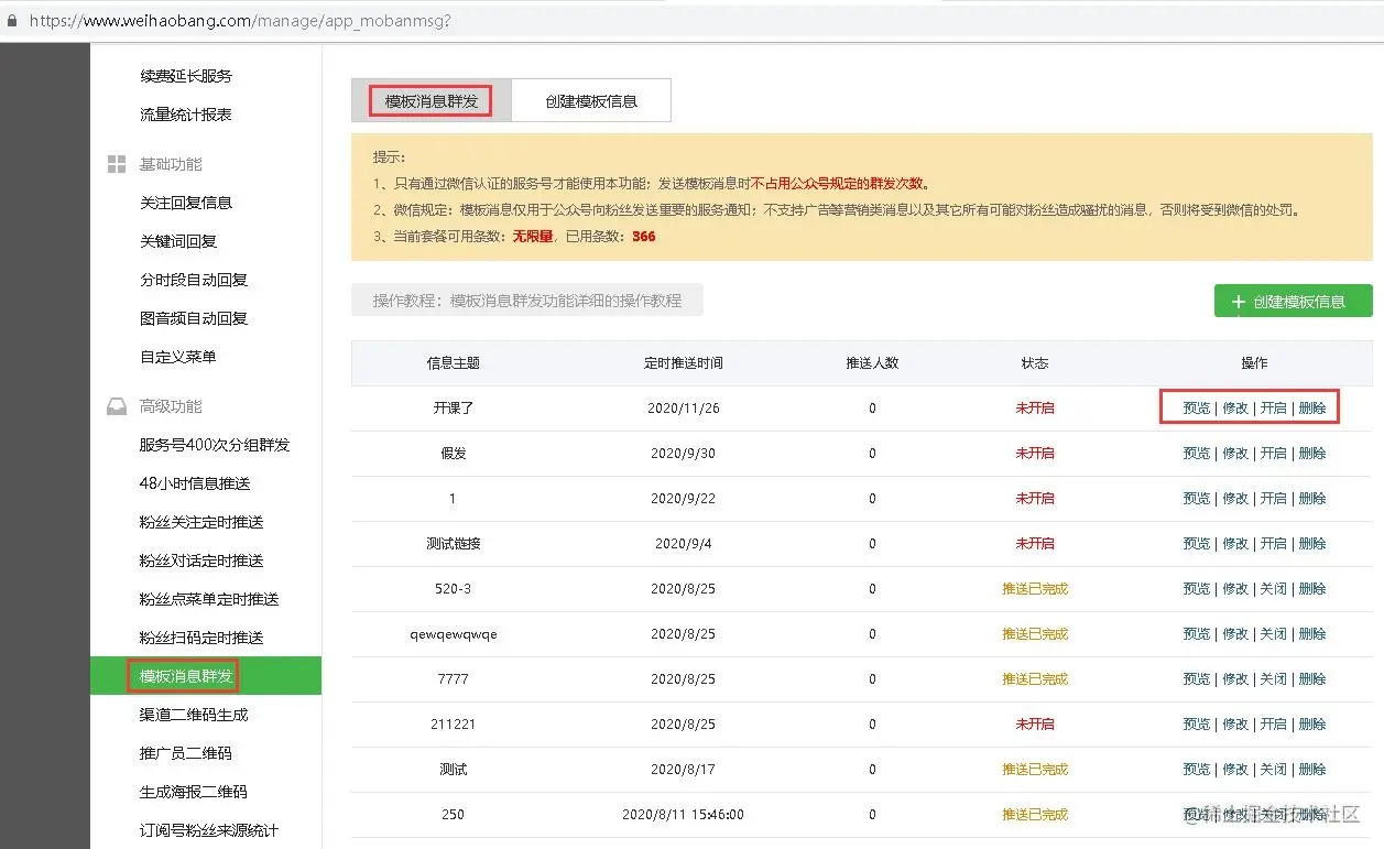 使用公众号平台模板消息功能,只能为公众号添加模板和自定义所在行业,如果想要群发模板消息,可以自己根据公众号平台的接口编程实现,或者直接用微号帮平台功能模板消息群发,都可以为公众号群发模板消息,支持添加粉丝昵称,自定义颜色,群发效果预览,自定义未来30天内延迟群发任务,设置粉丝点击模板消息进入小程序或任意链接、页面模板、话题标签、投票表单。支持新建多个群发任务,每个任务完成后都可实时查看已群发人数。模板消息群发突破服务号每月群发的限制,每天默认上限100000次(具体看公众号粉丝数)。
