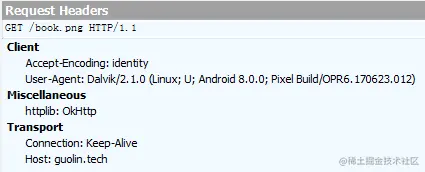 可以看到,在 HTTP 请求头中确实有我们刚才自己添加的 httplib: OkHttp。也就说明,Glide 的 HTTP 通讯组件的确被替换成功了。
