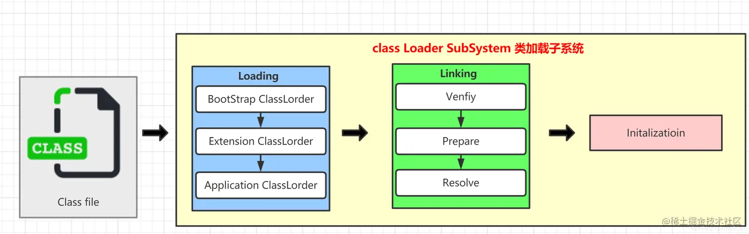 类加载子系统,就是用 classloader 把一个 class 文件加载进运行时数据数据区,动起来。