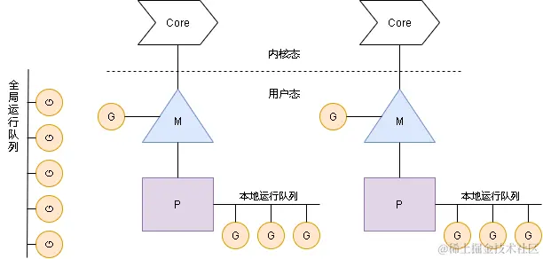 M-P-G调度是在用户态完成。其中M和G的关系是多对多(M:N)。即M个线程负责对N个G进行调度,内核对M个线程进行调度。