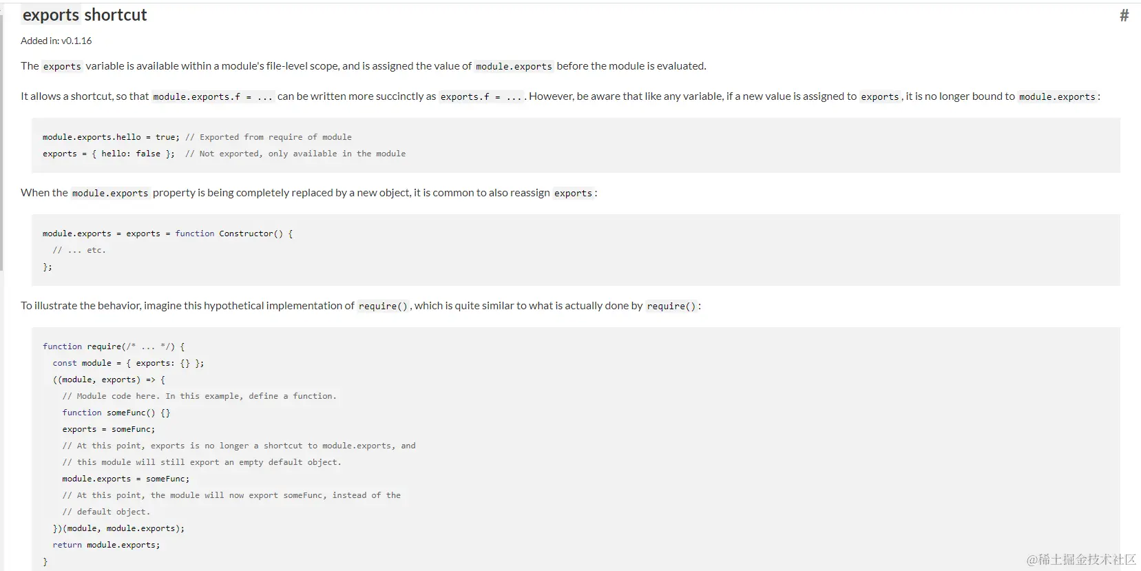 Node 为每一个模块提供了一个 exports 变量来指向 module.exports 。