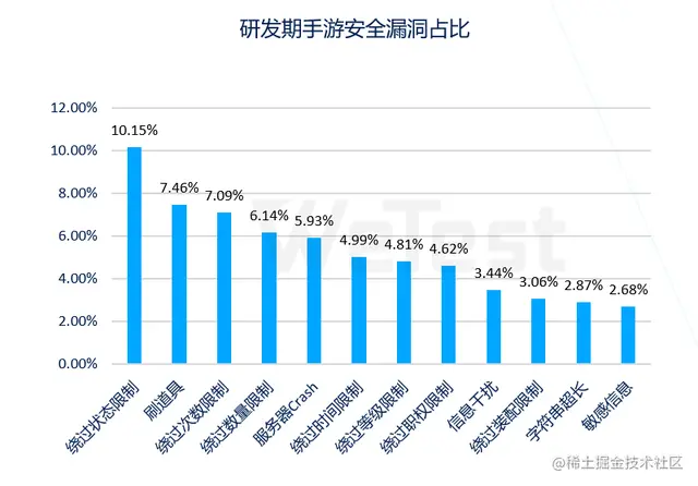 在2020年,造成严重影响的安全漏洞占比增长至51.34%,致命影响的安全漏洞占比降低至25.57%。通过所有安全漏洞分析,最为频繁的手游安全漏洞问题为“绕过状态限制”,常见案例如在游戏中使用未拥有的皮肤和表情、未完成任务领取奖励等。