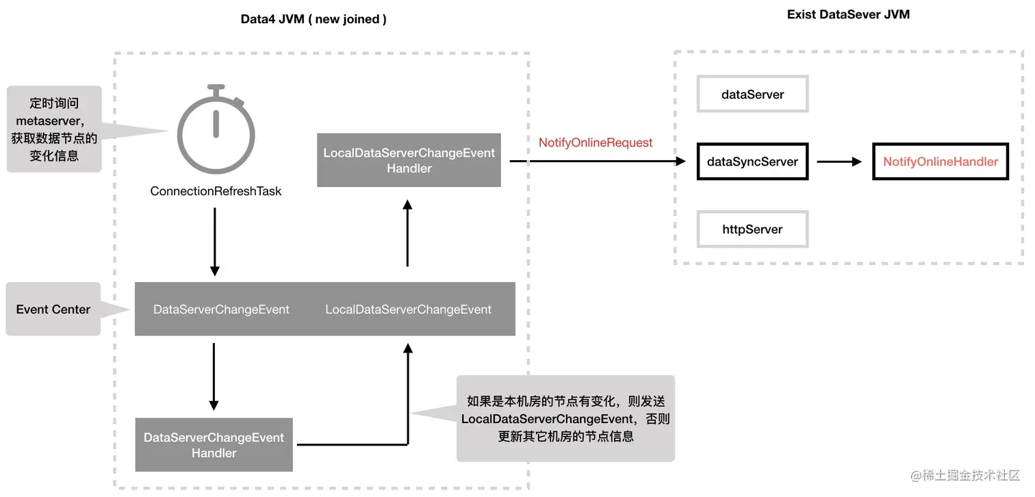 当轮询信息返回数据节点有变化时,会向 EventCenter 投递一个 DataServerChangeEvent 事件,在该事件的处理器中,如果判断出是当前机房节点信息有变化,则会投递新的事件 LocalDataServerChangeEvent,该事件的处理器 LocalDataServerChangeEventHandler 中会判断当前节点是否为新加入的节点,如果是新节点则会向其它节点发送 NotifyOnlineRequest 请求,如图所示: