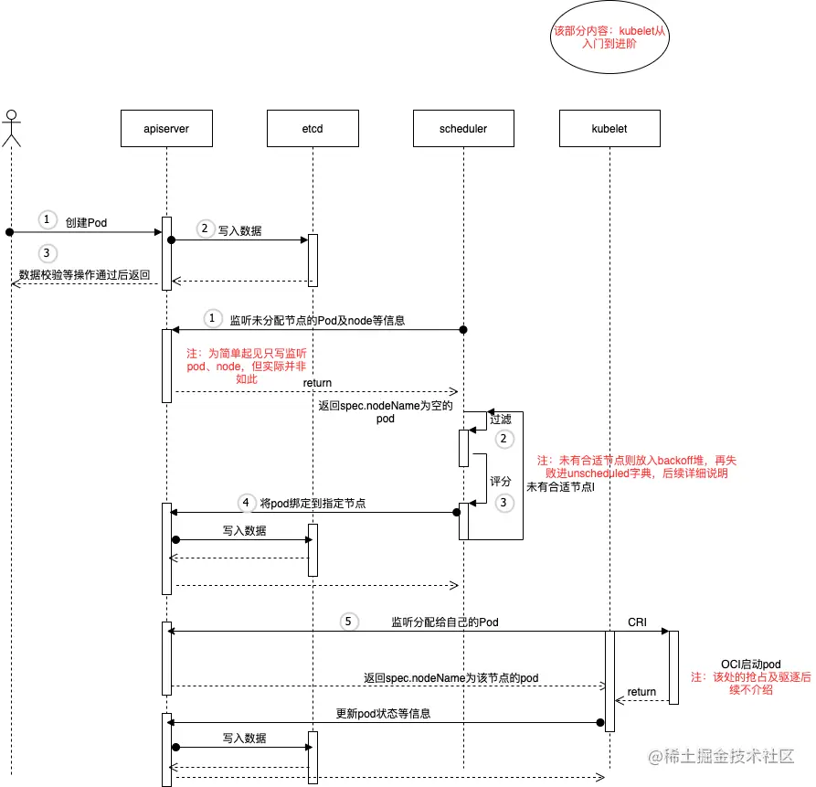 kubelet监听分配给自己的Pod,调用CRI接口进行Pod创建(该部分内容后续出系列,进行介绍)