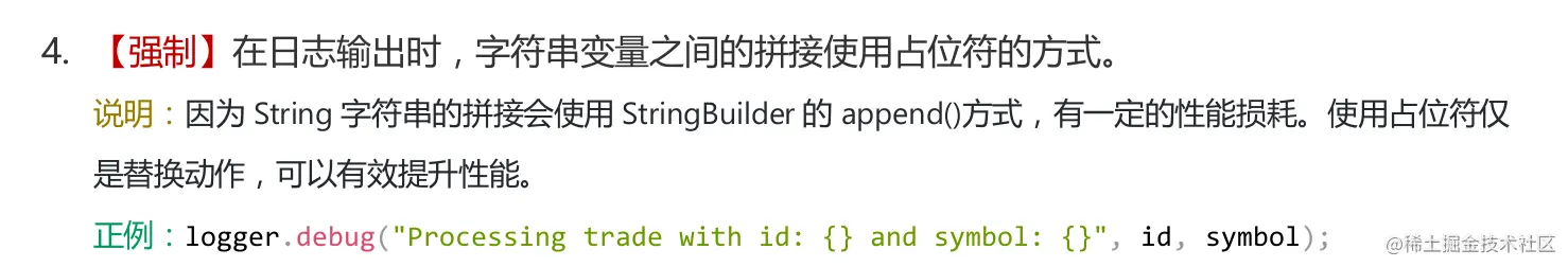但是他却不建议使用这种方式,理由是日志框架内部会有一个把占位符"{}"替换成目标变量的耗时过程,考虑到info方法可能被频繁调用,对性能有影响,所以建议直接拼接,代码如下: